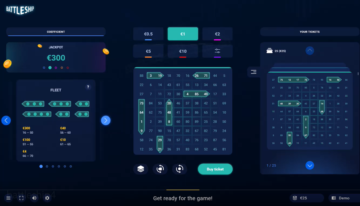 - 四種獲勝方式中的第一種稱為 Jackpot,賠率為 1 比 300。如果玩家在前 10 個球中擊沉 4x1 戰艦,則獲勝。