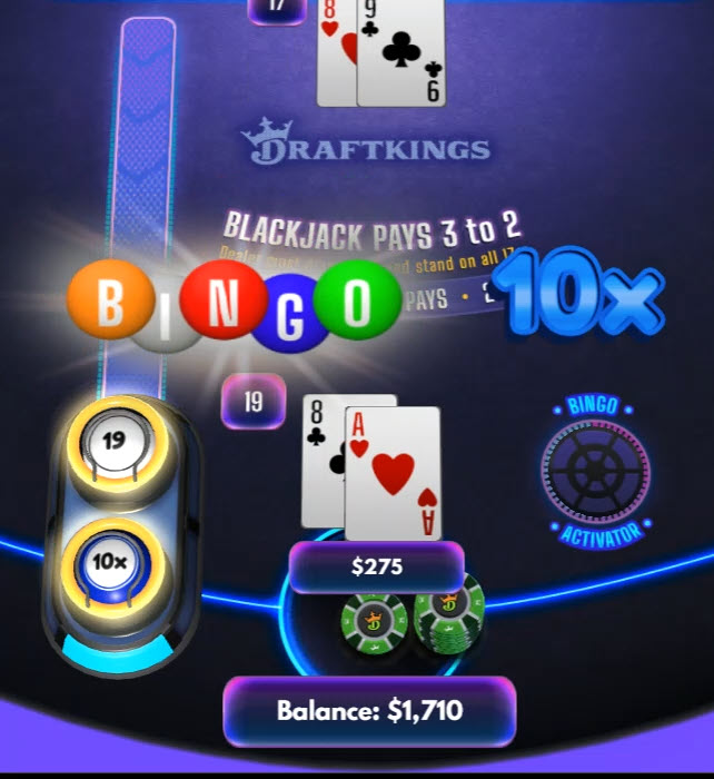 在上面這手牌中,我下注25美元,另加5美元的賓果啟用費。目標點數是19,乘數是10倍。我拿到了軟19,所以停牌。莊家拿到17了。由於我的19贏了,我獲得了10比1的賠付,總共贏了250美元,加上我最初的賭注,總回報是275美元。