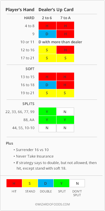 自從我的書出版以來,我一直擔心我的「簡單策略」的錯誤成本太高。因此,在2009年9月,我制定了以下「巫師策略」。相對於拉斯維加斯大道的寬鬆規則,由於不完美玩法造成的成本僅為 0.14%。這相當於每 12 小時遊戲一手牌的成本。與基本策略中的 250 個單元相比,巫師策略只有 21 個單元,如下所示。