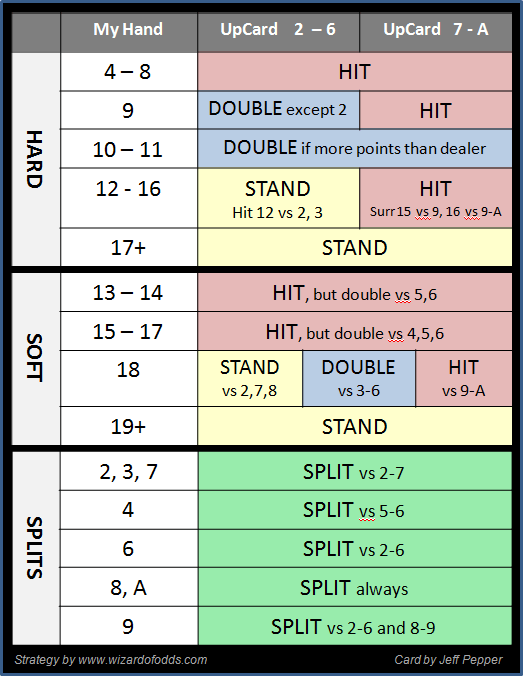 自從我的書出版以來,我一直擔心我的「簡單策略」的錯誤成本太高。因此,在2009年9月,我制定了以下「巫師策略」。相對於拉斯維加斯大道的寬鬆規則,由於不完美玩法造成的成本僅為 0.14%。這相當於每 12 小時遊戲一手牌的成本。與基本策略中的 250 個單元相比,巫師策略只有 21 個單元,如下所示。