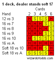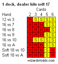 如果上面的表格資訊量太大,您可以參考下面的表格和列表,它們顯示了哪些情況下正確的玩法取決於玩家手中的牌數。這也是基於單副牌遊戲,莊家在軟17點時停牌。
