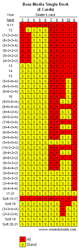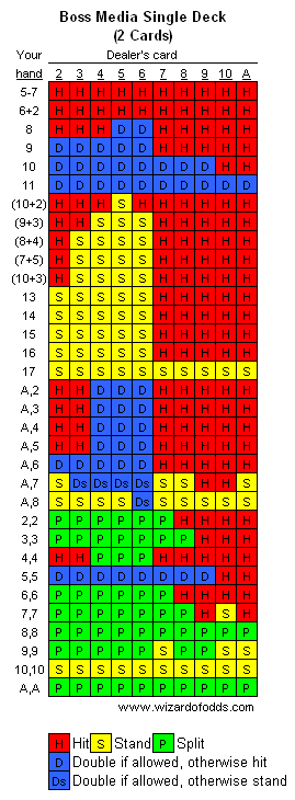 以下表格適用於 Boss Media 規則。它們也適用於 Microgaming 規則,但玩家不應在 11 點或 8 點對 10 點或 A 點時加倍,因為根據 Microgaming Classic Blackjack 規則,莊家不會偷看黑傑克。 Microgaming 也不允許在 8 點時加倍。