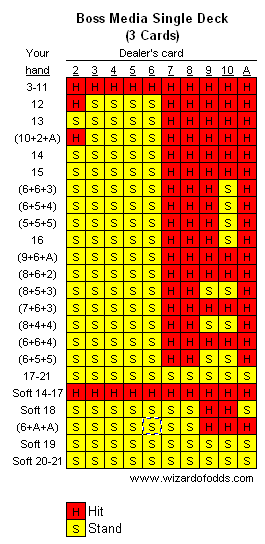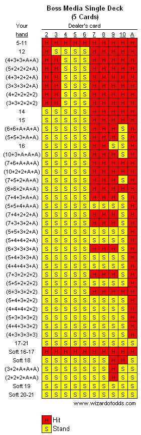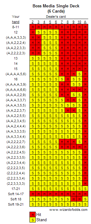 使用普通的全牌依賴型基本策略,在 Boss Media 規則下,玩家優勢為 0.11%,而在Microgaming規則下,莊家優勢為 0.13%。這些策略可以在我的Boss Media和Microgaming評測中找到。全牌依賴型基本策略是根據玩家手牌總數的最佳玩法。然而,有時,尤其是在單副牌遊戲中,根據玩家手中的具體牌型,也會有例外。例如,綜合考慮所有因素,如果莊家有 2,停牌比拿 13 要好。但是,如果莊家有 10 和 3,如果莊家有 2,拿 10 和 3 要好。下表是組合依賴型基本策略,這是根據玩家手牌具體組合的最佳玩法。如果是三張或更多牌,策略相同。使用本頁上的組合依賴策略將使莊家優勢降低 0.04%,或者俱體來說,在 Boss Media 規則下,玩家將獲得 0.1541% 的優勢。