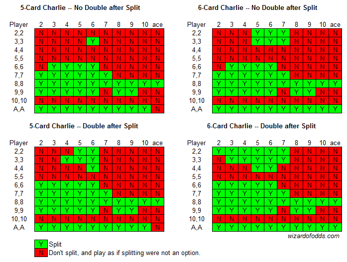 下圖展示了分牌策略,這取決於分牌後是否允許加倍,以及是否適用五張牌或六張牌的查理規則。七張牌的查理規則應該不會有變動。同樣,這與黃的策略略有不同,我更傾向於後者。