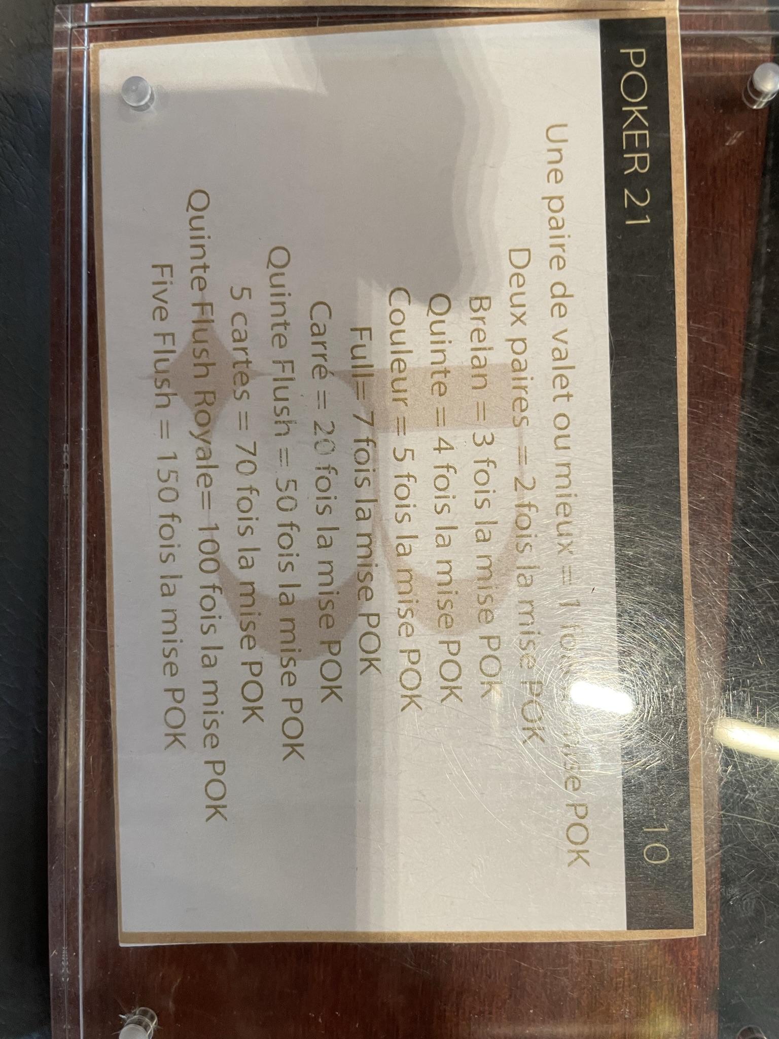 21點撲克是我在2022年9月17日在巴黎Le Club Barriere注意到的一種二十一點附加賭注。沒錯,巴黎確實有一些小型的純賭桌賭場。我去的那傢俱樂部地址是香榭麗舍大道104號。