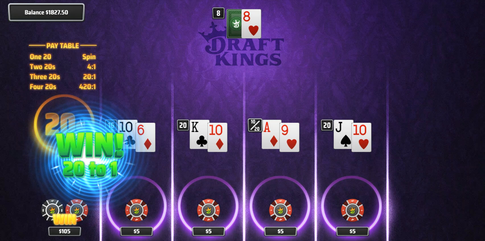 四個20不僅是警方對持有大麻的監管代碼,也是DraftKings推出的二十一點遊戲。這款遊戲的正式名稱是“四個20點二十一點”,但我把它當作一種附加賭注,簡稱“四個20點”。它的玩法與傳統的四手二十一點類似,只是要求玩家進行附加賭注。附加賭注的賠償取決於玩家在前四手牌中拿到的20點數量。
