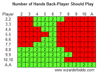 下表顯示了後玩家應該選擇玩的牌局數量。錶基於無限多副牌,無論莊家拿到軟17點後是否要牌或停牌,數量都相同。表中假設分牌後允許加倍。此外,表中還包含明顯不好的分牌,這是為了完整性起見,並非暗示控制牌的玩家應該分牌。該表還假設前玩家會繼續重新分牌,即使這是糟糕的玩法。
