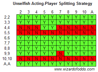 下表指的是無私玩家,他會根據後手玩家的利益決定是否分牌。如果兩位玩家串通一氣,且後手玩家的下注金額遠大於行動玩家的下注金額,則可能會發生這種情況。下表顯示了行動玩家何時應該分牌,假設允許分牌後加倍,且牌堆數量不限。莊家拿到軟17點時,是否要牌或停牌都無關緊要。