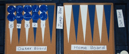 - 跳桿:內板和外板之間的桿。第一次擲骰的目標是讓兩塊棋子都越過跳桿。