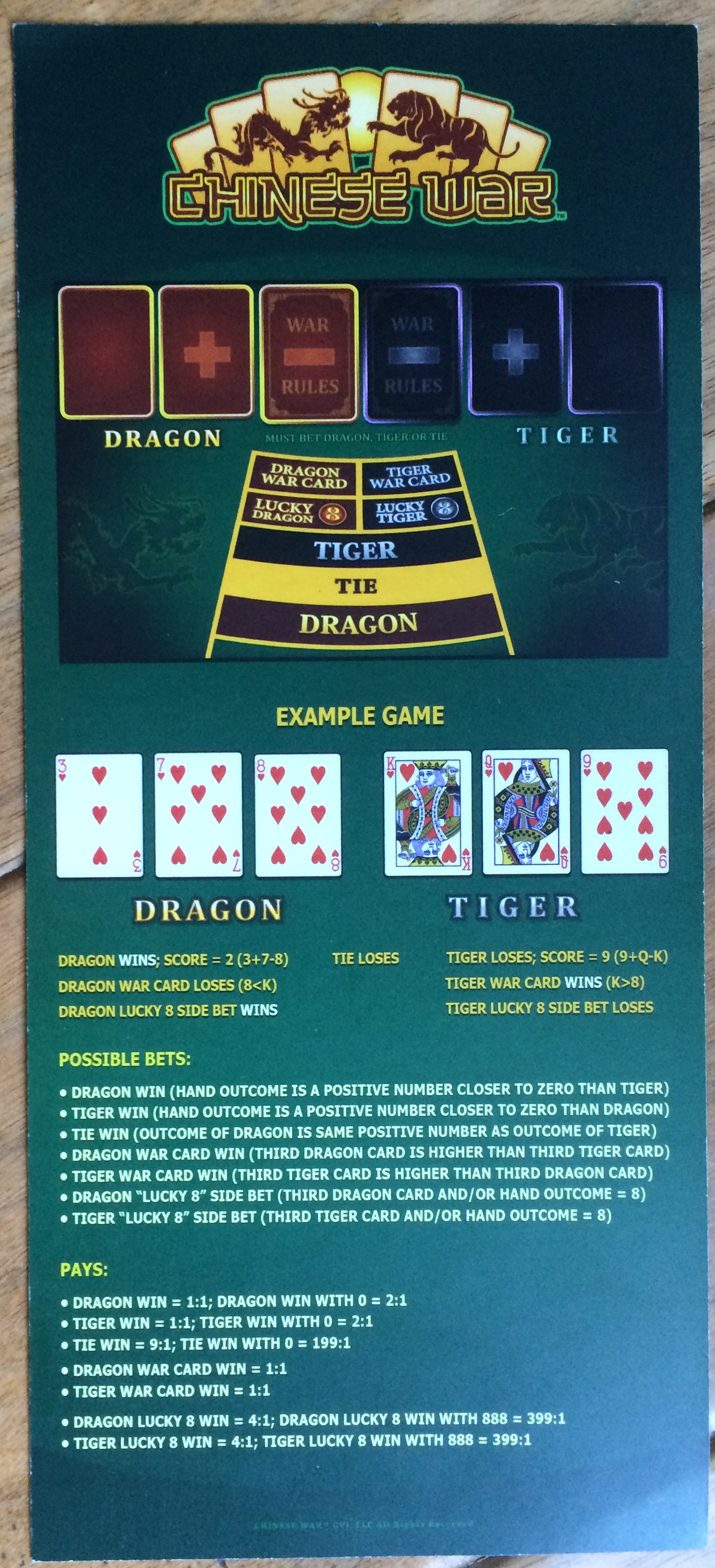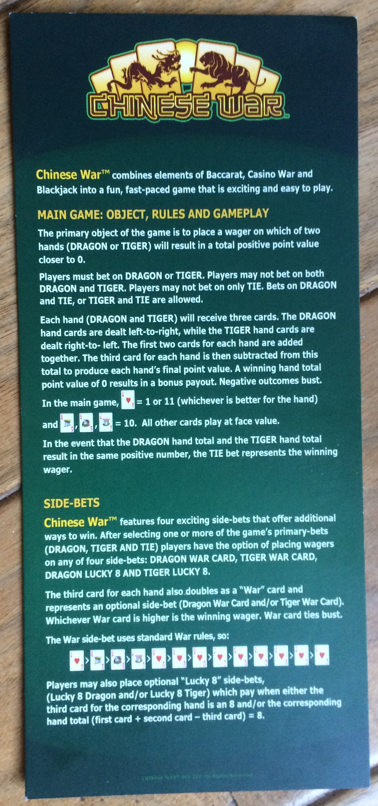 「中國戰爭」是我在2017年1月25日拉斯維加斯黃金海岸的實地測試中註意到的一款新遊戲。如果硬要把它與其他遊戲比較,它就像是賭場戰爭、二十一點和百家樂的混合體。遊戲共有七種投注方式,根據龍和老虎兩手牌的結果進行。