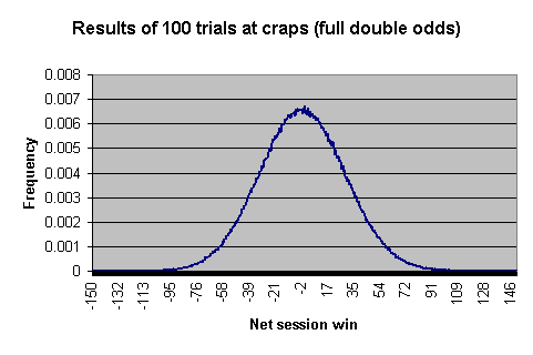 下表顯示了100次嘗試或最終擲出結果(come out rolls)後預期的淨盈虧。為了方便繪製圖表,假設玩家在過線(pass line)上投注1美元,並接受雙倍賠率。