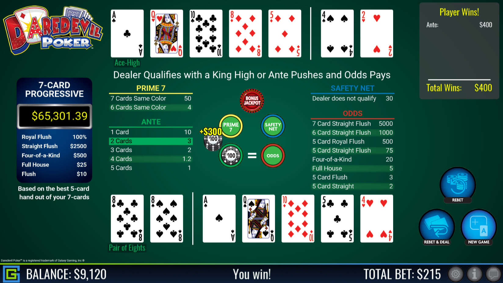 下圖中,我在 Ante 和 Odds 上各下注 100 美元。我還在 Prime 7、Safety Net 和 Bonus Jackpot 上各下注 5 美元。我選擇只持有對 8。