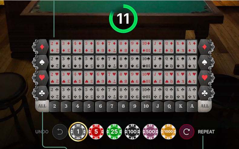 - 遊戲開始時,玩家在52張標準牌中任一張上下注。玩家可以隨意下注。