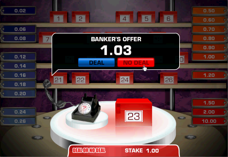 然後我被要求打開另外六個盒子。選完六個之後,剩下的金額分別是:0.02美元、0.06美元、0.08美元、0.12美元、0.14美元、0.16美元、0.18美元、0.20美元、0.24美元、0.26美元、0.50美元、0.60美元、0.70美元、0.80美元、0.90美元、1.00美元、1.20美元、1.50美元、2.00美元和10.00美元。
