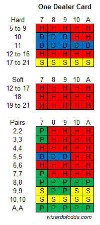 下表顯示了針對一張莊家明牌的策略,該策略與常規二十一點中針對四到八副牌的策略相同,並且莊家拿到軟 17。