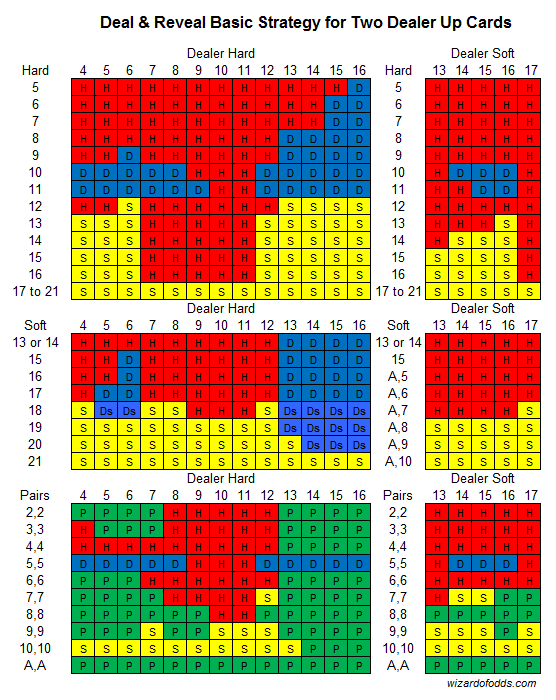由於莊家兩張牌時,22 點會被推翻,因此策略取決於莊家亮出一張還是兩張牌。第一個表格顯示了莊家亮出兩張牌時的策略。