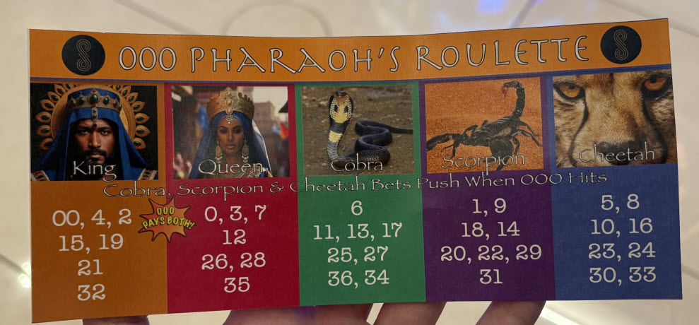 法老王輪盤包含五種附加賭注。它於2025年10月在拉斯維加斯的撒哈拉酒店亮相。
