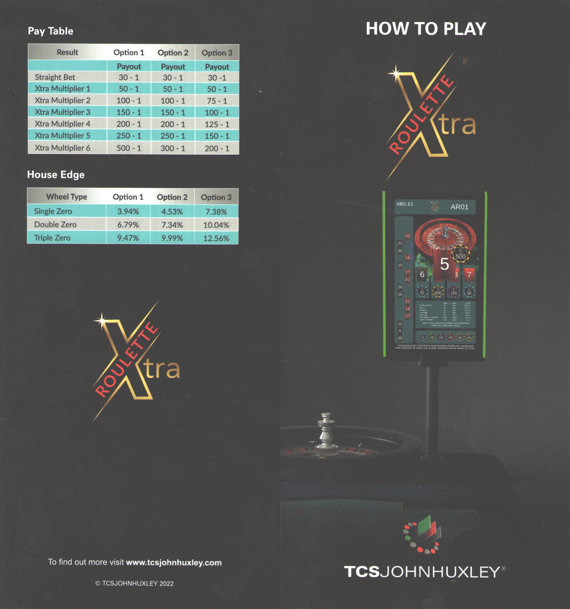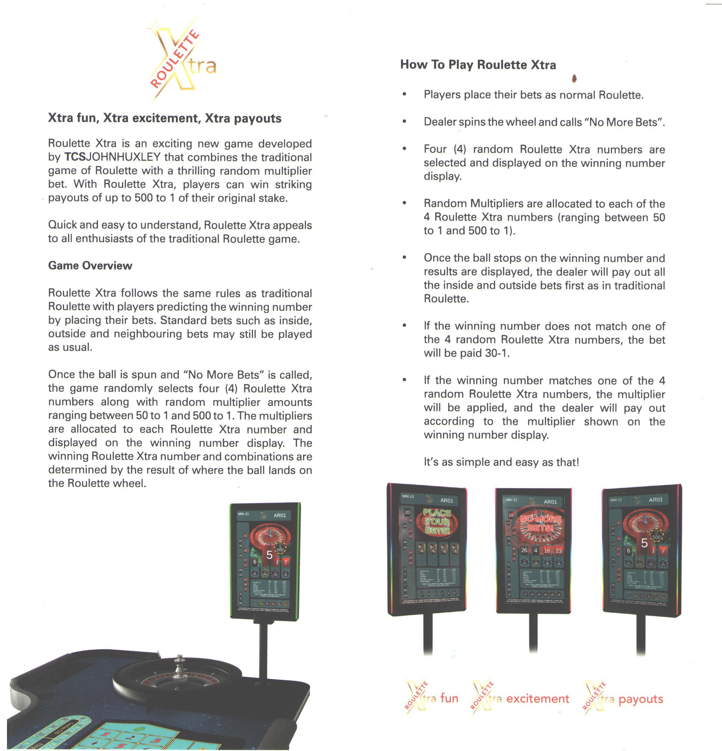 Xtra Roulette 是由輪盤製造商 TCS John Huxley 開發的輪盤變體。除了單注號碼投注外,其他所有投注方式均與傳統輪盤相同。單注號碼投注的贏率範圍從 30 到 200 到 500 比 1,取決於所使用的版本。