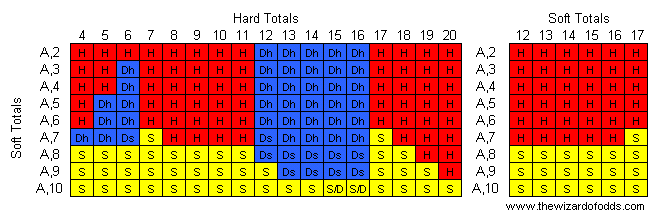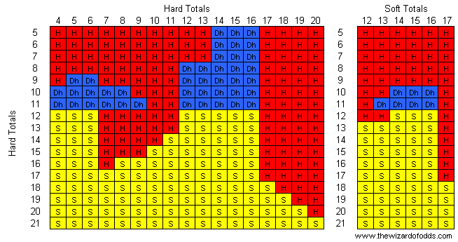 下表顯示了當莊家在軟 17 點時獲得雙倍曝光的基本策略。若要使用圖表,請沿著左列尋找玩家的手牌,沿著頂行尋找莊家的手牌。