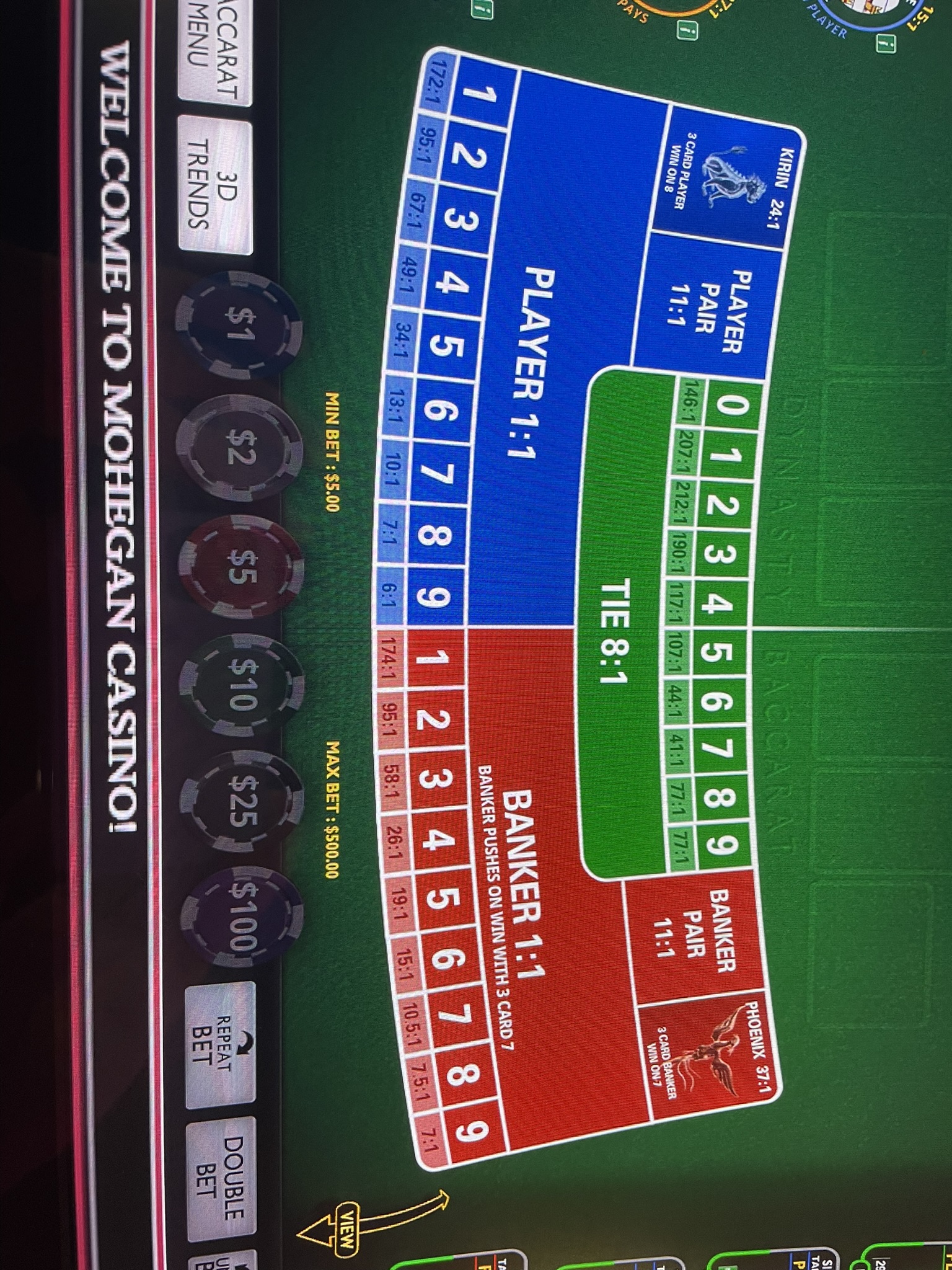 有些百家樂遊戲會提供對獲勝方(或平手)和獲勝方(或平手總分)的邊注。下圖展示了2024年全球博彩博覽會上一款電子賭桌遊戲的此類投注範例。