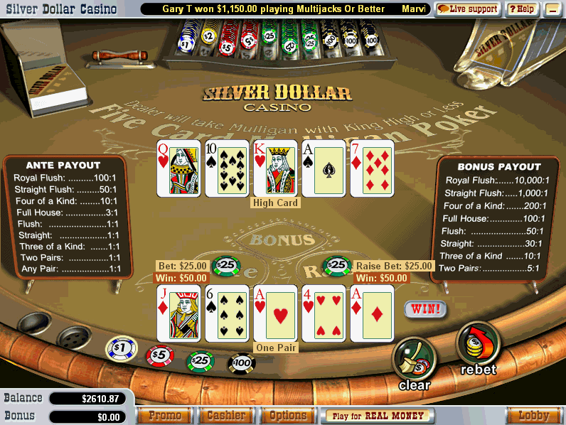 五張牌穆里根撲克(Five-Card Mulligan Poker)是一種已停產的撲克變體,曾在使用Odds On軟體的網路賭場中出現。遊戲已由本人申請專利(專利號7,735,830 )。