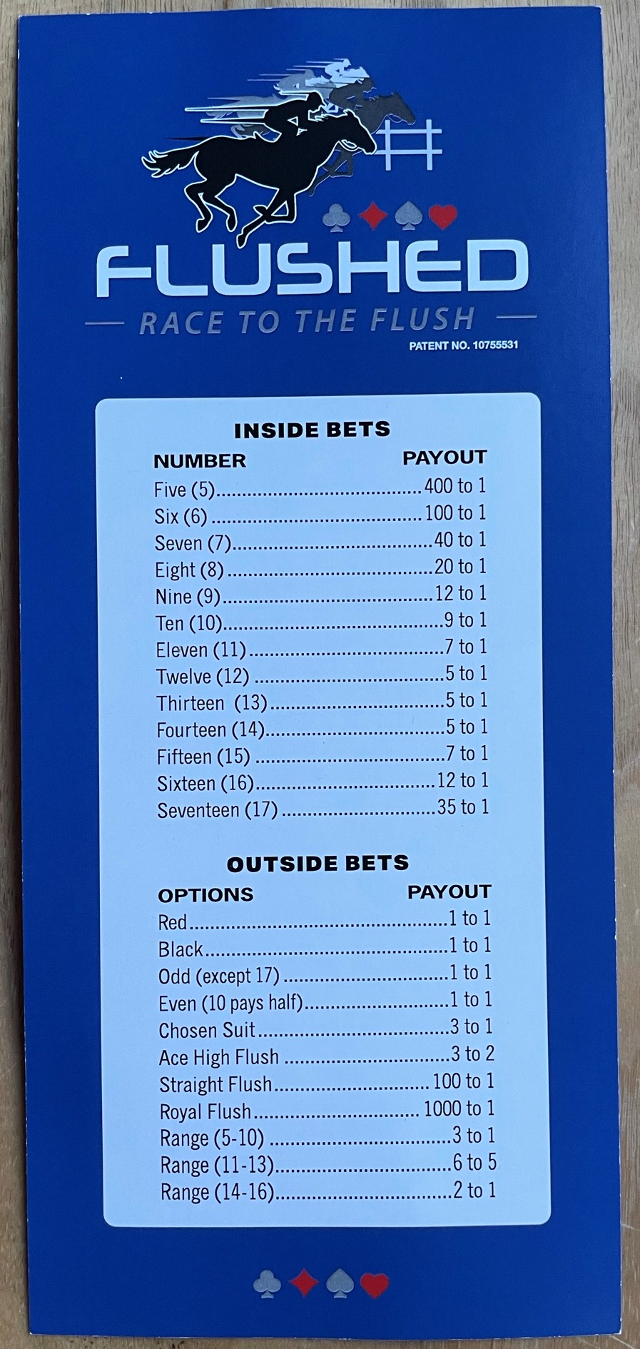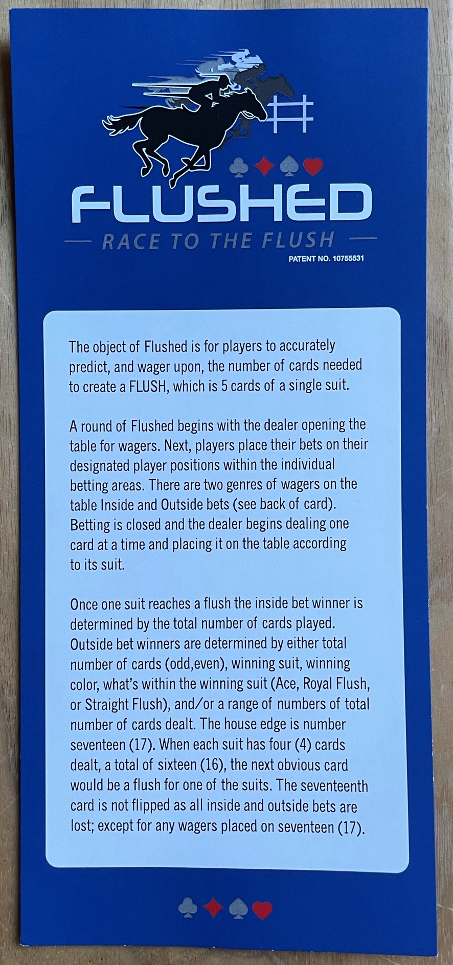 Flushed 於 2021 年 2 月 2 日在 Stratosphere 開始現場試驗。其原理是,荷官會從一副 52 張牌的牌堆中發牌,直到拿到同花為止。玩家可以押注這副同花的顏色、花色、撲克牌點數以及需要多少張牌才能拿到。