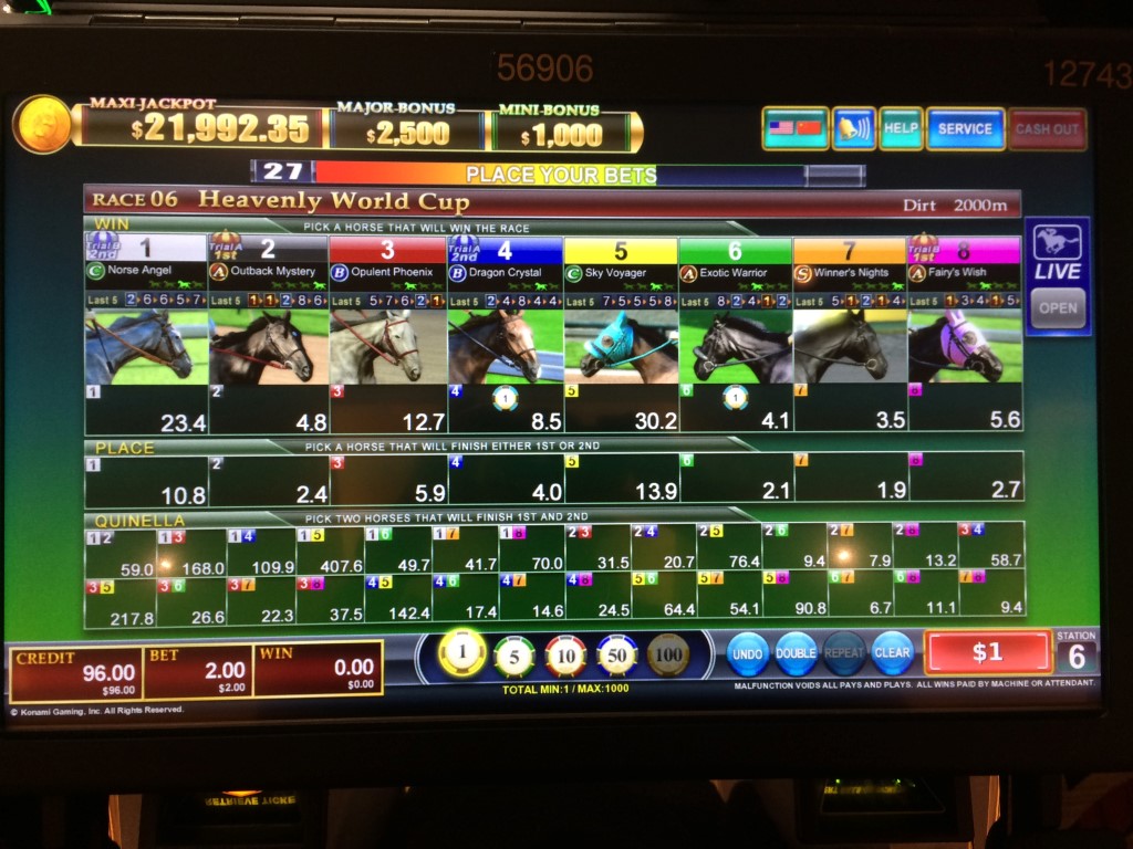 這款遊戲還有三個累積獎金。據我了解,有時投注結束後會隨機抽出一匹馬。如果這匹馬贏得比賽,玩家將贏得其中一個累積獎金。我不知道這匹馬的中獎頻率、平均中獎金額,以及它對遊戲回報的貢獻有多大。我不確定是否必須對這匹馬進行投注,或者累積獎金是否以及如何在玩家之間分配。