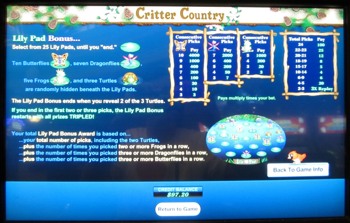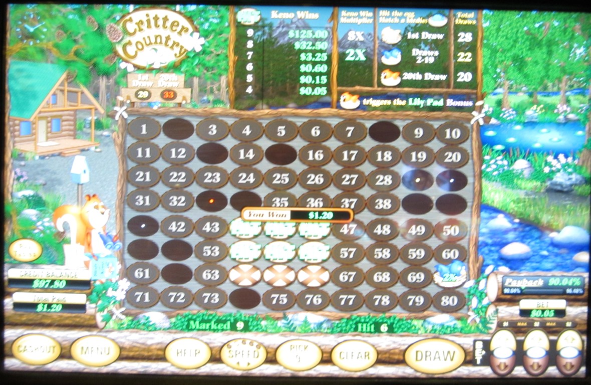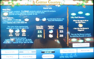 Critter Country 是一款基於基諾的遊戲,可以在 U1 Gaming 生產的多遊戲機上使用。我在拉斯維加斯的拉斯維加斯俱樂部、Rampart 和 Dotty's 賭場都見過這樣的機器。 Critter Country 的特色是遊戲會隨機選擇一個未選中的數字來放置一個彩蛋。如果其中一個隨機抽取的數字擊中彩蛋,玩家就可以贏得倍數、額外的彩球或獎勵回合。