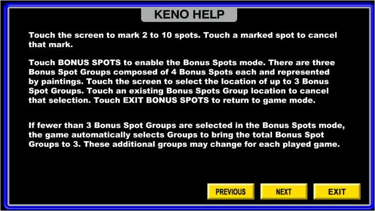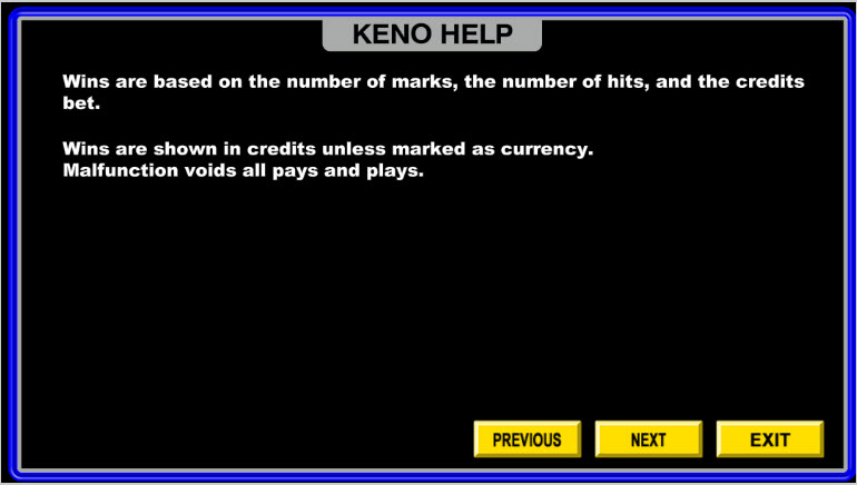 上圖來自同一場獎勵遊戲。四個額外的球,分別是21、27、41、42,均未命中任何號碼,導致該獎勵遊戲結束。請注意,上方那幅畫,覆蓋了5、6、15和16,被擊中三次,分別落在5、6和16上。擊中該畫三次,玩家將獲得2倍的賠率。通常情況下,擊中七個號碼的賠率為33。使用2倍的賠率,玩家贏得該遊戲的賠率為2 × 33 = 66。