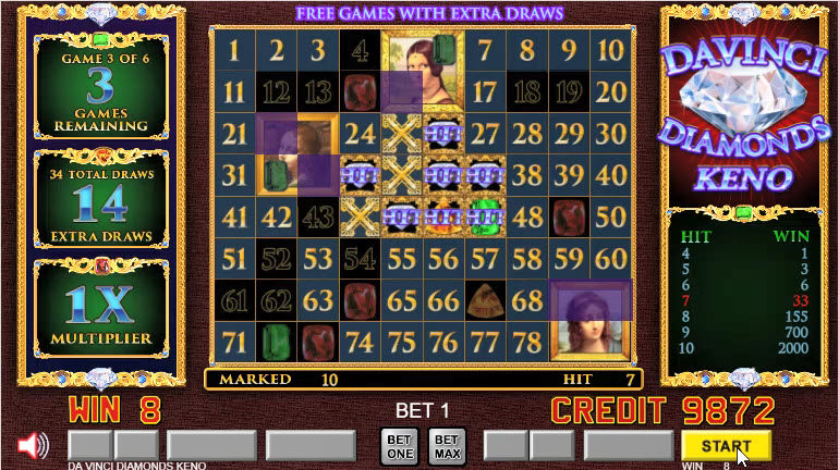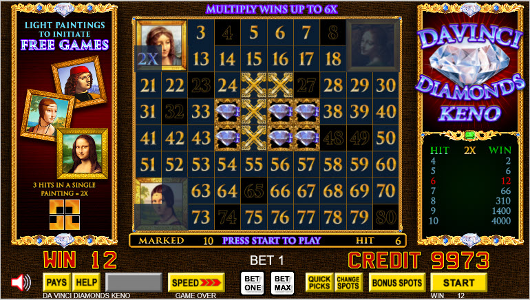 Davinci Diamonds 是基諾遊戲的一個變體。我第一次注意到它是在 2021 年,當時我在 VideoPoker.com 和拉斯維加斯的 Resorts World 賭場。除了常規的點數基諾規則外,遊戲還在數字區域放置了 2x2 的畫作。如果玩家涵蓋了足夠的畫作牌,就可以贏得乘數和獎勵回合。在獎勵回合中,玩家可以獲得免費旋轉,只要抓住畫作上的數字,就可以贏得額外的彩球。