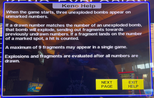 基諾爆炸 (Keno Explosion) 是 IGT 推出的基諾遊戲。玩家需要將炸彈放在三個未選的數字上。如果抽出的球與炸彈對應的數字匹配,炸彈就會爆炸;如果炸彈碎片擊中玩家選擇的數字,則算中獎。
