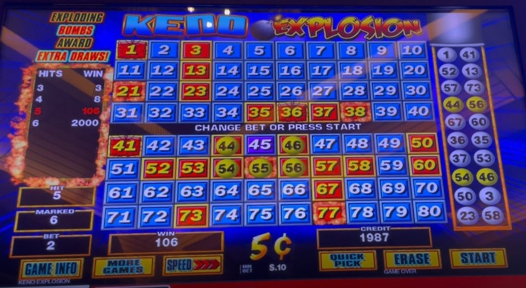對遊戲進行隨機模擬,假設各方面都採用自然賠率,結果顯示回報率為 82.49%。據我所知,該遊戲的開發商 IGT 只允許將賠率設定到 85%。在紅岩賭場的同一台機器上,其他 5 美分基諾遊戲的平均回報率為 89.45%。這進一步證明遊戲有缺陷,因此與自然抽獎(每個號碼的抽獎機率均等)相比,抽獎過程中的球更有可能中炸彈。