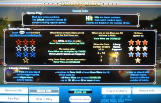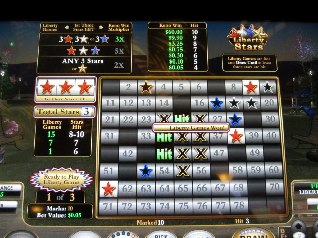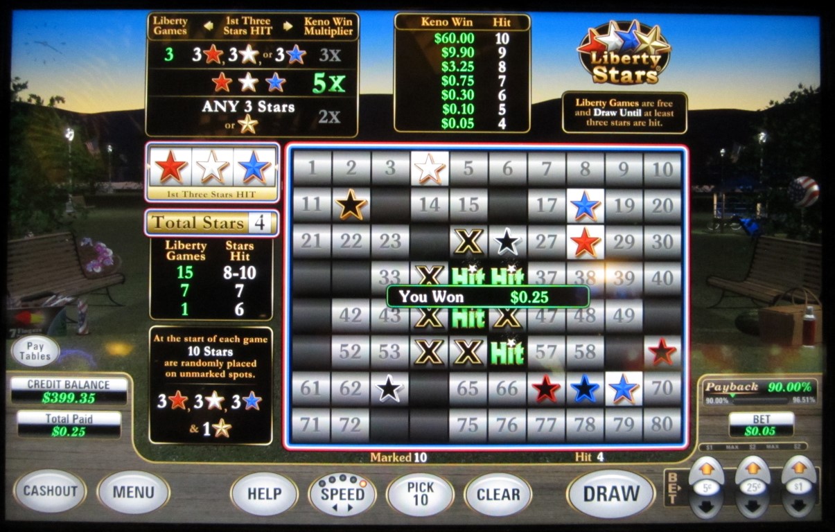Liberty Stars 是一款基於基諾的遊戲,可在U1 Gaming生產的多遊戲機上使用。我在拉斯維加斯的拉斯維加斯俱樂部、Rampart、El Cortez 和 Dotty's 賭場都見過這樣的機器。 Liberty Stars 的特色是遊戲會隨機在玩家未選擇的十個數字上放置一顆星。這些星星可以是紅色、白色、藍色或金色。如果遊戲抽取的 20 個數字與星號匹配,玩家就可以贏得乘數或獎勵遊戲。