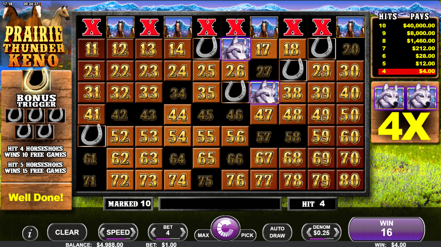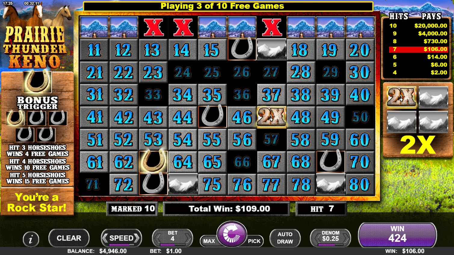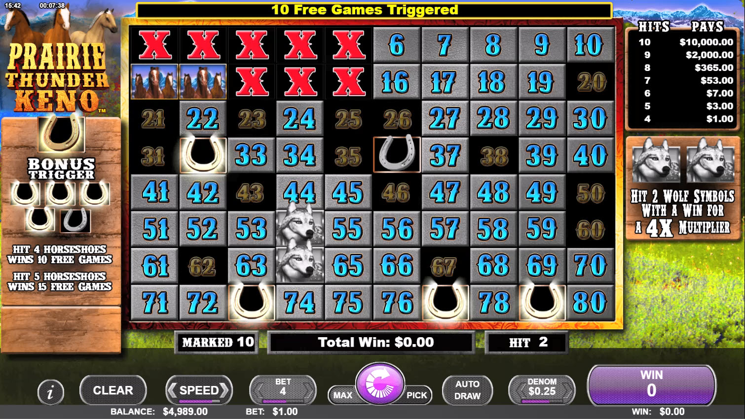 Prairie Thunder Keno 是一款基諾遊戲,提供乘數和免費旋轉,乘數更高。它由 Grand Vision Gaming 製作。我第一次注意到這款遊戲是在 DraftKings 賭場。