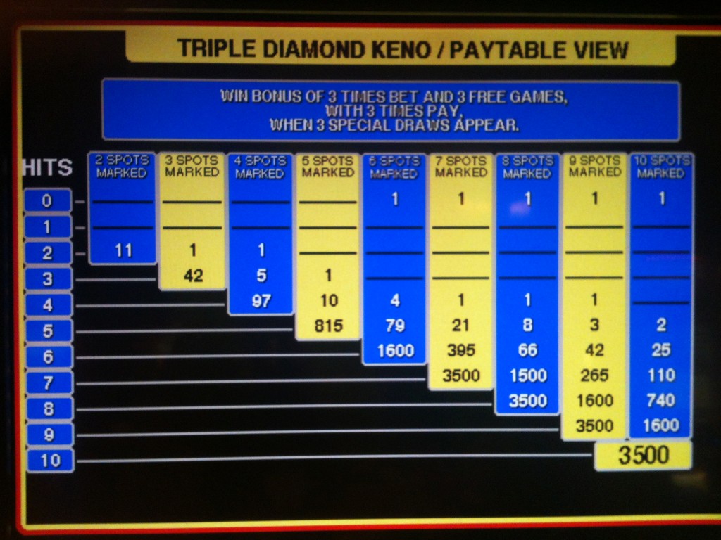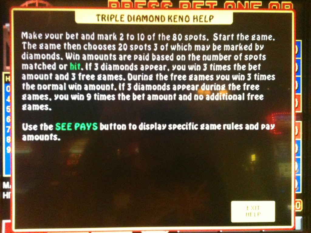 目前,這款遊戲相當老舊,很難找到。我猜想在小型陰極射線 GameMaker 機上玩贏錢的幾率最高。這款遊戲的原理與Caveman Keno類似,但畫面不如 Caveman Keno 驚艷,這或許也是 Triple Diamond Keno 逐漸式微的原因。