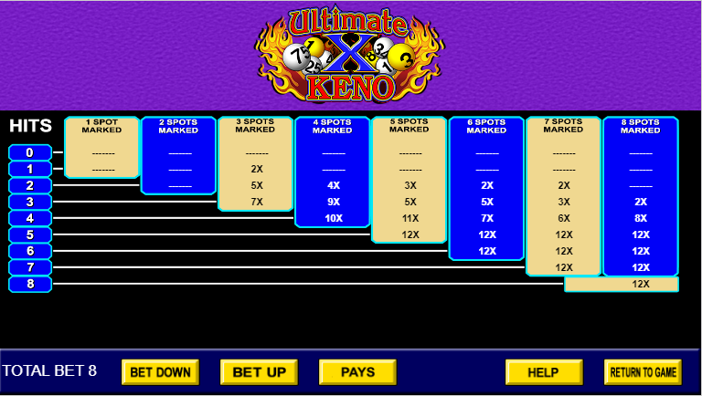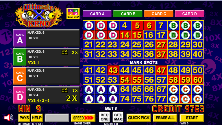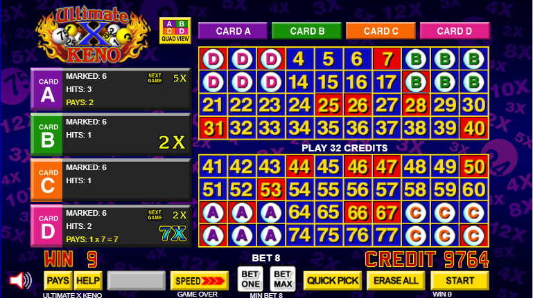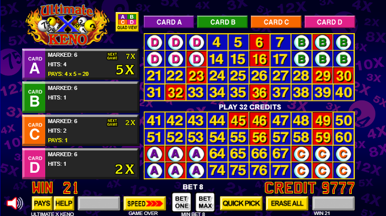 Ultimate X Keno 的玩法與普通的四張牌點數基諾類似,但玩家除了可獲得即時獎金外,還能贏得同一張牌下一場遊戲的倍數。要使用此功能,玩家必須加倍投注。本場遊戲的獎金是基於總投注金額的一半。