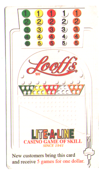 Lite-a-Line 是彈珠台和賓果遊戲的結合。它類似於彈珠遊戲,因為你用柱塞將球射到棋盤上;但它也像賓果遊戲,因為你希望球連續突出五個點,這樣你就能贏。當球穿過棋盤上的 25 個孔時,五乘五的記分卡上對應的格子就會亮起。玩家通常下注 1 美元,贏家將獲得 15 美元。