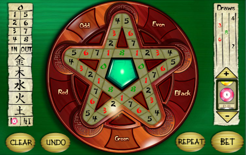 幸運星輪盤是一款簡單的數字遊戲。遊戲盤是一個五角星形,上面有40個點,編號從0到8。一束移動的光線繞著五角星旋轉,最終停在一個隨機數字上。內部五角星角上的五個點位於兩條線的交點上,因此每個點的機率是其他不在交點上的點的兩倍。