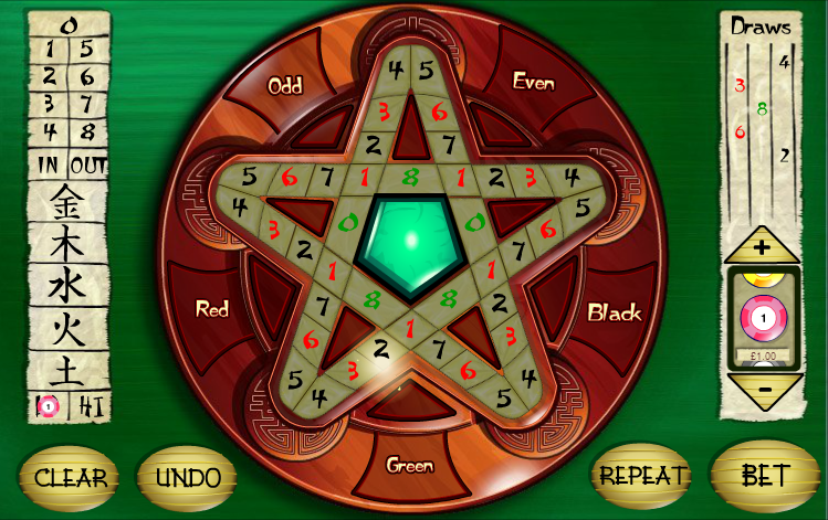 - 金、木、水、火、土:這是五種中國符號。每個符號佔據五角星的一條線。記住,其中兩個點位於交叉點上,因此權重加倍。因此,每個點的總中獎次數為 2×2 + 7 = 11。