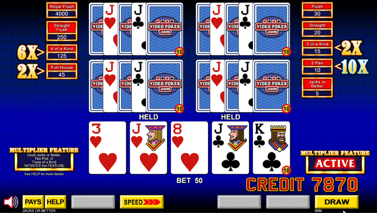 - 在基於 Jacks or Better 的遊戲中,如果玩家拿到 Jacks or Better、兩對或三條,並且他將手牌提升到某些特定牌型,那麼他將有資格獲得乘數。
