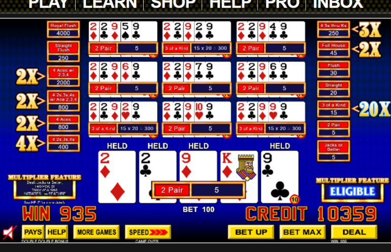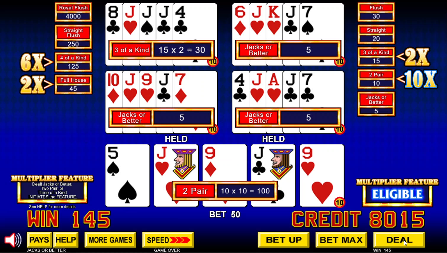 - 在基於 Jacks or Better 的遊戲中,將乘數獎勵給改進為兩對、三條、一小時或四條的玩家。