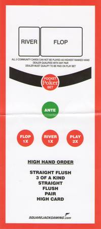 口袋撲克是一種可選的邊注,如果玩家的兩張底牌是一對、順子或同花順,則支付。即使玩家棄牌,他仍然有資格贏得口袋撲克賭注。下表顯示了該賭注的賠率表以及發佈到每手牌的機率。右下角單元格顯示賭場優勢為 2.41%。
