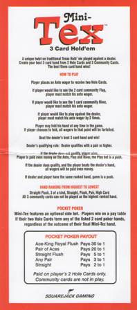 Mini-Tex 是一款德州撲克風格的遊戲,玩家與莊家對戰。遊戲的目標是透過使用兩張底牌和三張公共牌,獲得比莊家更好的三張牌,從而贏得勝利。