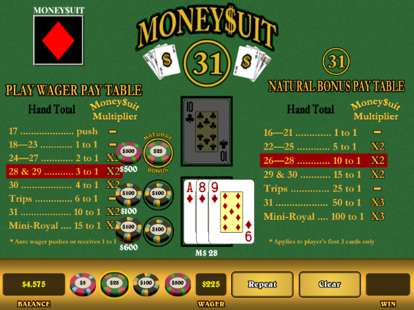 在上面這手牌中,我在底注(Ante)上押了100美元,在「Natural 31」上押了25美元。我的初始三張牌分別是A、8和方塊9。幸運的是,Money$uit也是方塊。這手牌本來就是28點的賠償牌,所以我又在「Play」上押了100美元。抽牌是梅花10,但這並沒有起到什麼作用。