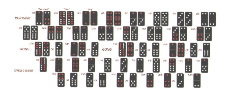 中國骨牌的每種牌型都由兩枚六面骰子投擲的結果組成。因此,共有 21 種獨特的牌型(6+5+4+3+2+1)。
