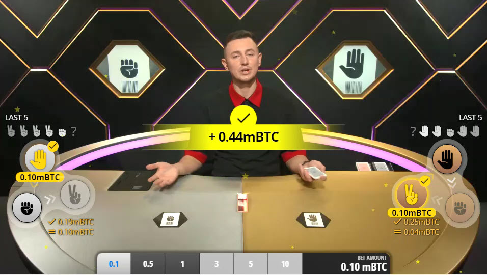 上圖中,我押注0.1 mBTC(1 mBTC 等於千分之一比特幣),銀手牌是紙牌,金手牌是剪刀。荷官在銀手牌上抽到石頭,在金手牌上抽到紙牌。結果兩手牌都贏了。銀手牌贏1.9倍賠率,金手牌贏1倍賠率,2.5倍賠率。我的總贏利是4.4個投注單位。由於我的投注單位是0.1 mBTC,我贏回了0.44 mBTC。其中0.2倍是我最初的投注,0.24倍是我獲利。