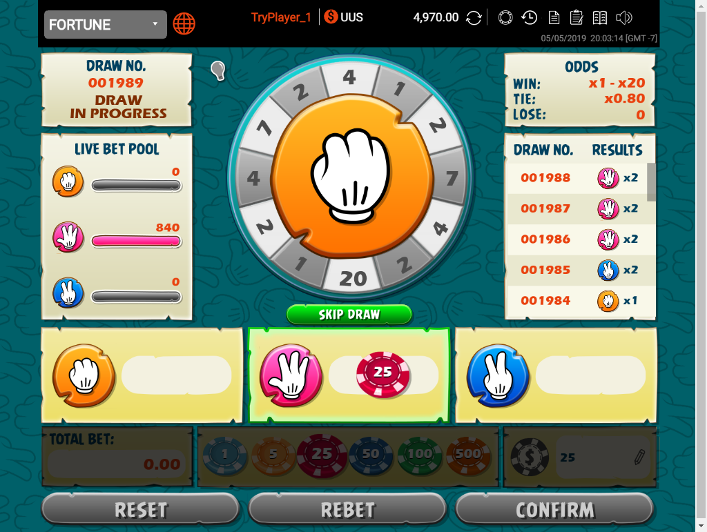 玩家選擇石頭、剪刀或布,計算機也會做出同樣的選擇。石頭勝剪刀,剪刀勝布,布勝石頭。若雙方擲出相同點數,則單次投注為平手。玩家也可以投注2局、3局或4局系列賽,在這些系列賽中,玩家必須贏得每局(平手即輸)才能贏得投注。