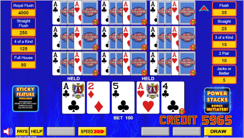 Power Stacks Poker 是一種視訊撲克變體,如果玩家在發牌時拿到某些牌,就可以用「黏牌」贏得額外的牌。
