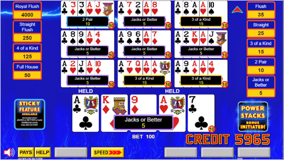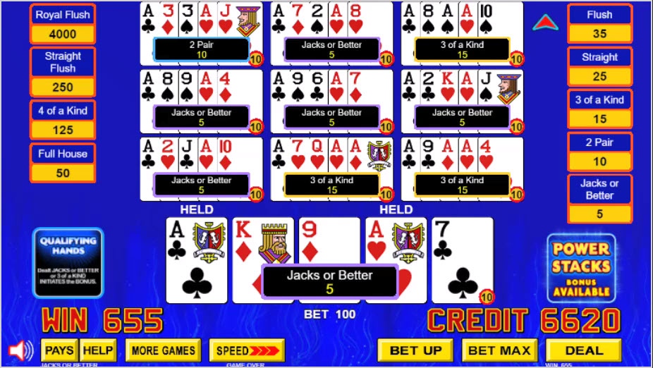 - 如果啟用了 Power Stacks 功能,當玩家拿到一對 J 或更好的牌或三張相同的牌時,他就會玩該功能。