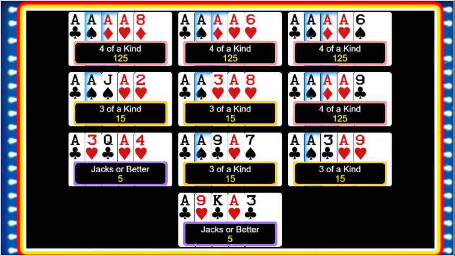 我付錢玩了10手牌,其中一對A有一次升級成了兩對,三次升級成了三條。以每局5個硬幣下注計算,這些牌局的總贏利為5 * (6*1 + 1*2 + 3*3) = 85。